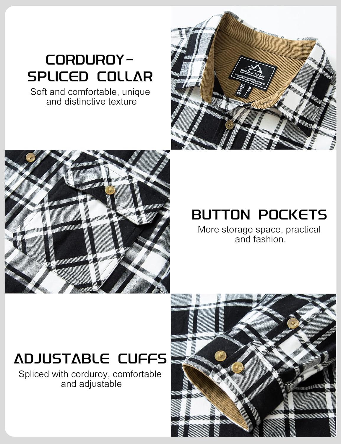 TACVASEN Flannel Shirt for Men Long Sleeve Plaid Shirt Corduroy Cuff Collar Casual Lightweight Cotton Button Down Shirts(Black)