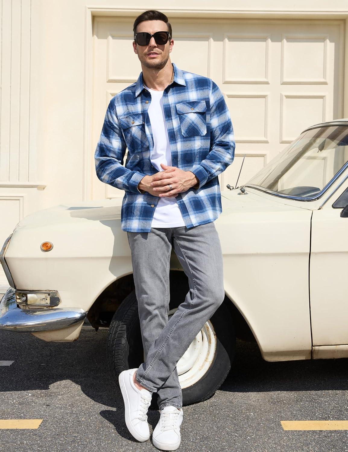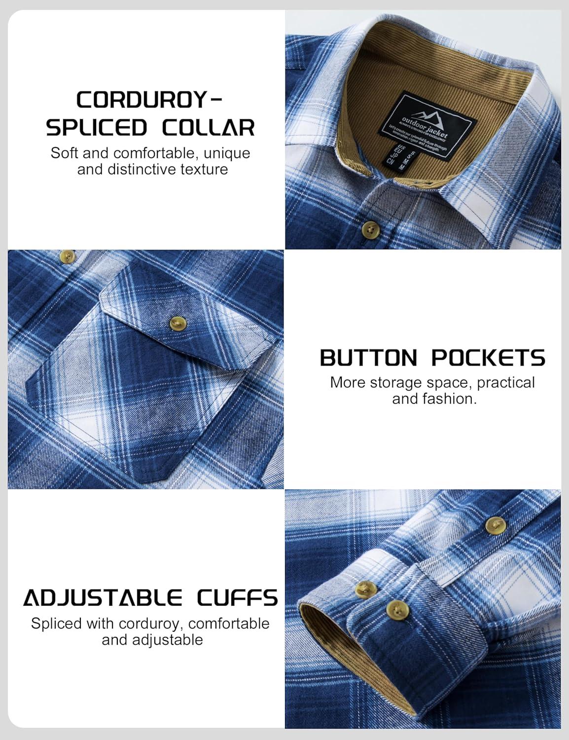 TACVASEN Flannel Shirt for Men Long Sleeve Plaid Shirt Corduroy Cuff Collar Casual Lightweight Cotton Button Down Shirts(Blue Grey)