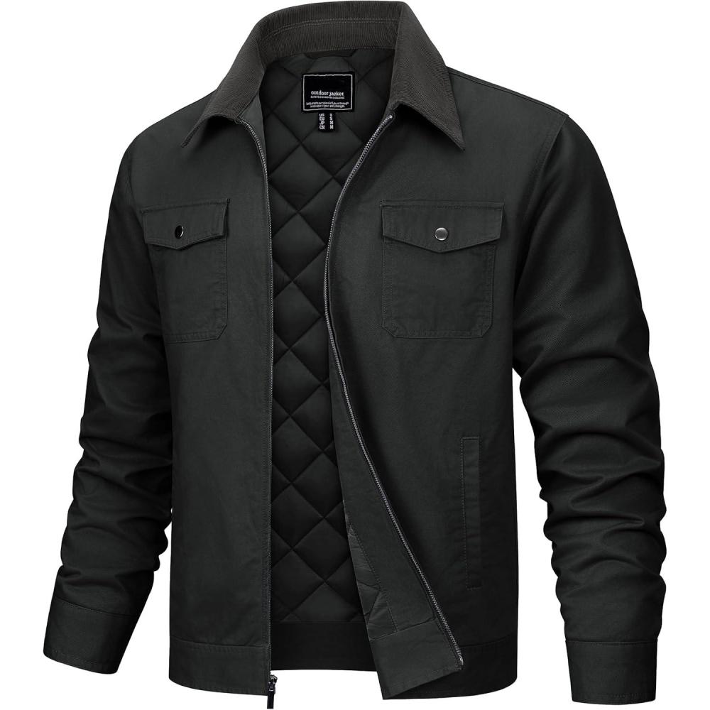 TACVASEN Men’s Casual Quilted Cotton Jacket Cargo Corduroy Collar Jacket Work Shacket with 5 Pockets for Fall and Winter(Black)