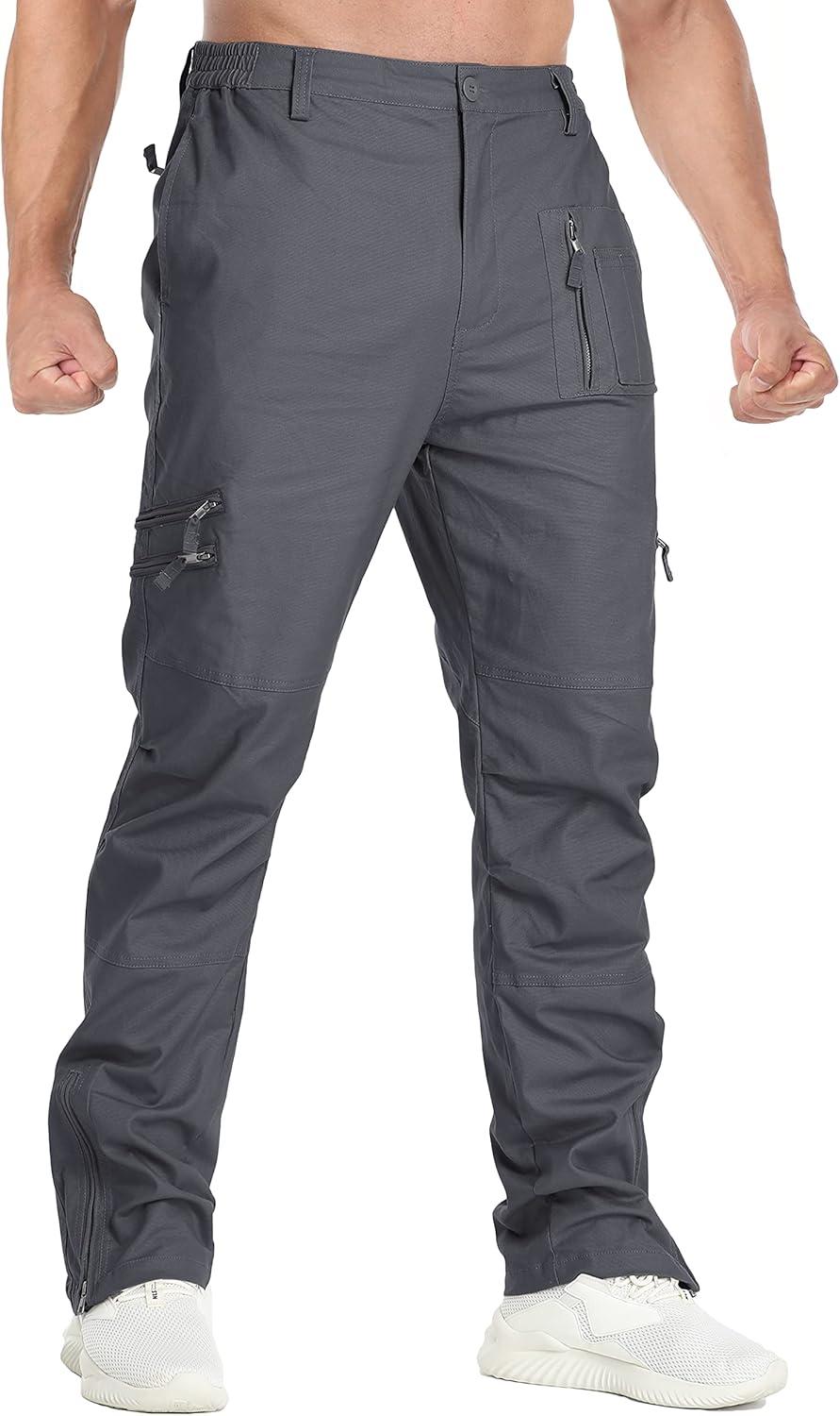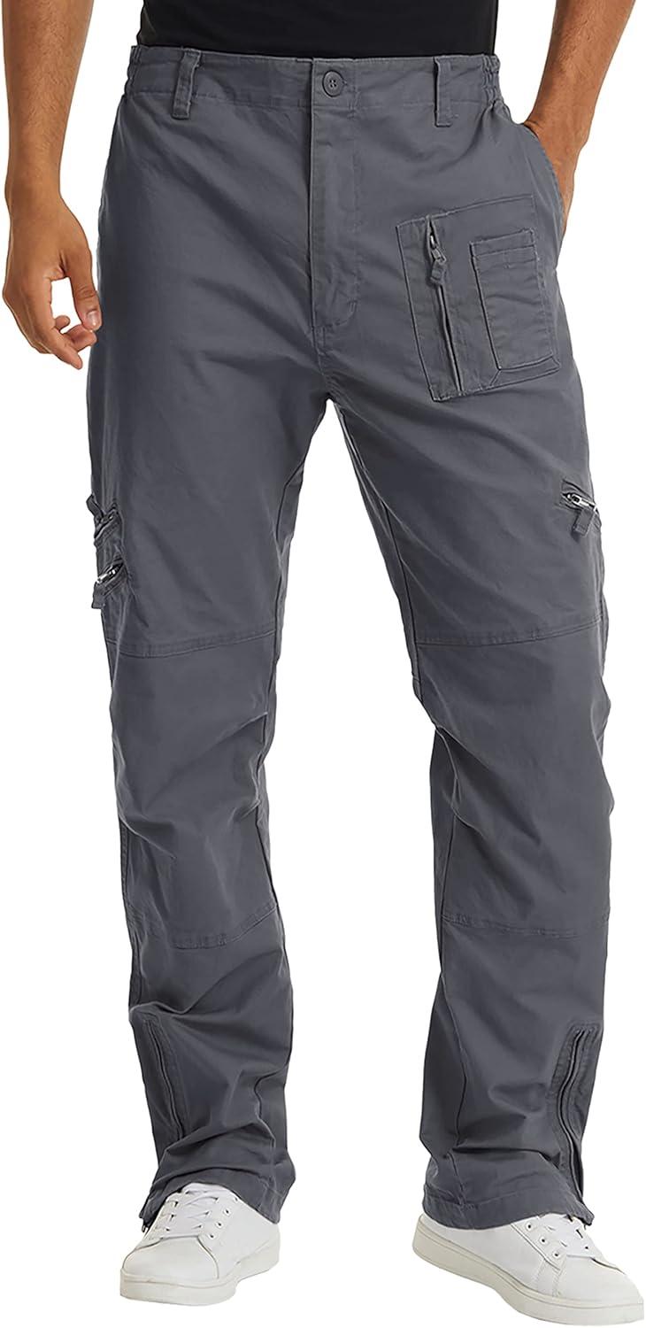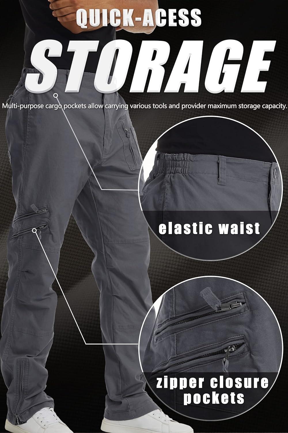 TACVASEN Men’s Cotton Cargo Long Pants 9 Pockets Elastic Waist Military Work Hiking Outdoor Pants(No Belt)(Grey)