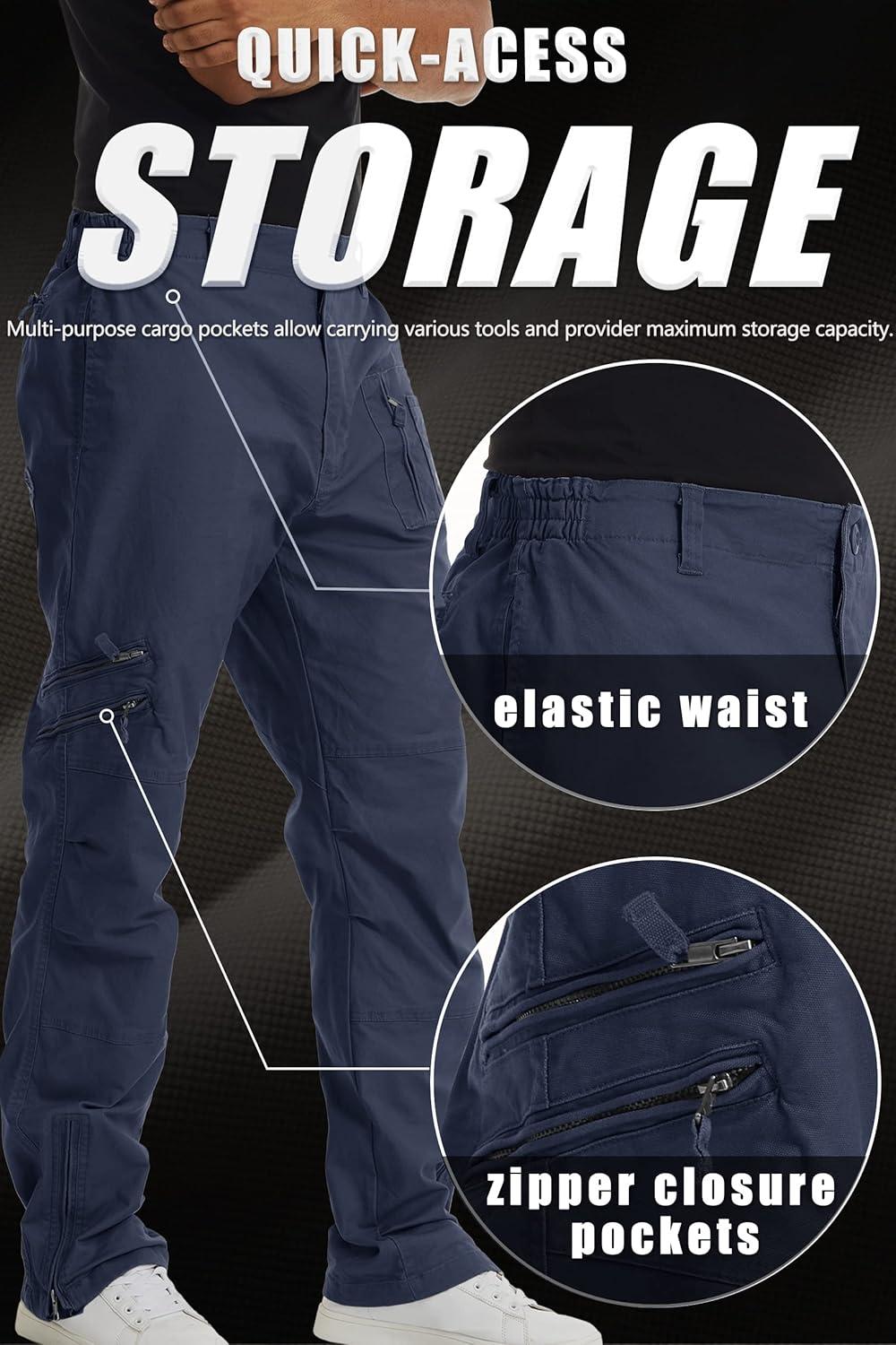 TACVASEN Men’s Cotton Cargo Long Pants 9 Pockets Elastic Waist Military Work Hiking Outdoor Pants(No Belt)(Navy)