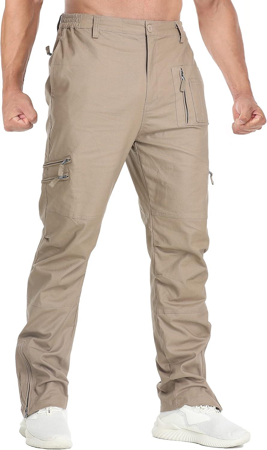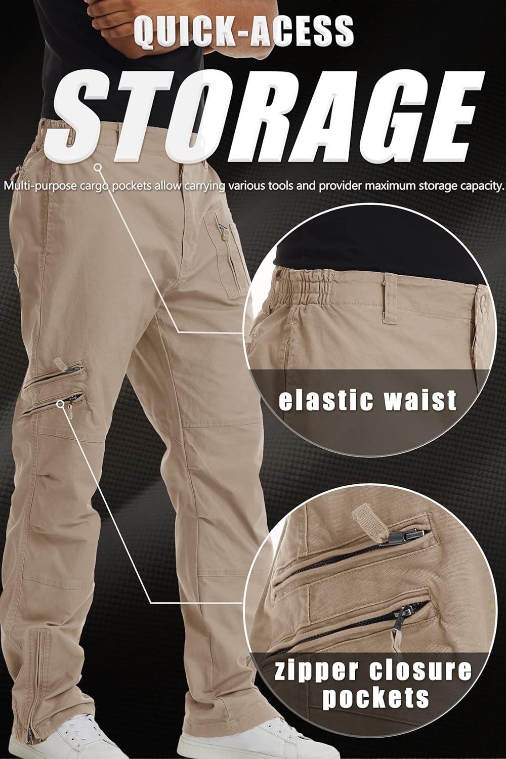 TACVASEN Men’s Cotton Cargo Long Pants 9 Pockets Elastic Waist Military Work Hiking Outdoor Pants(No Belt)(Sand)