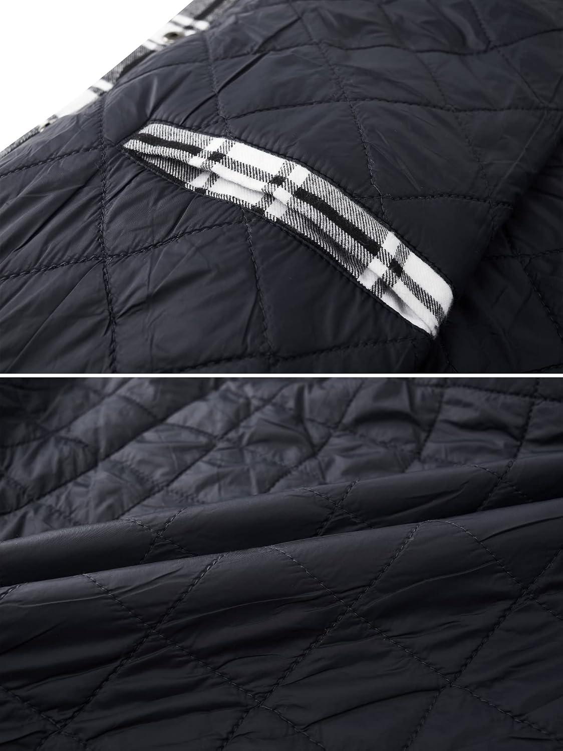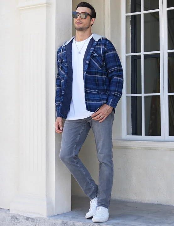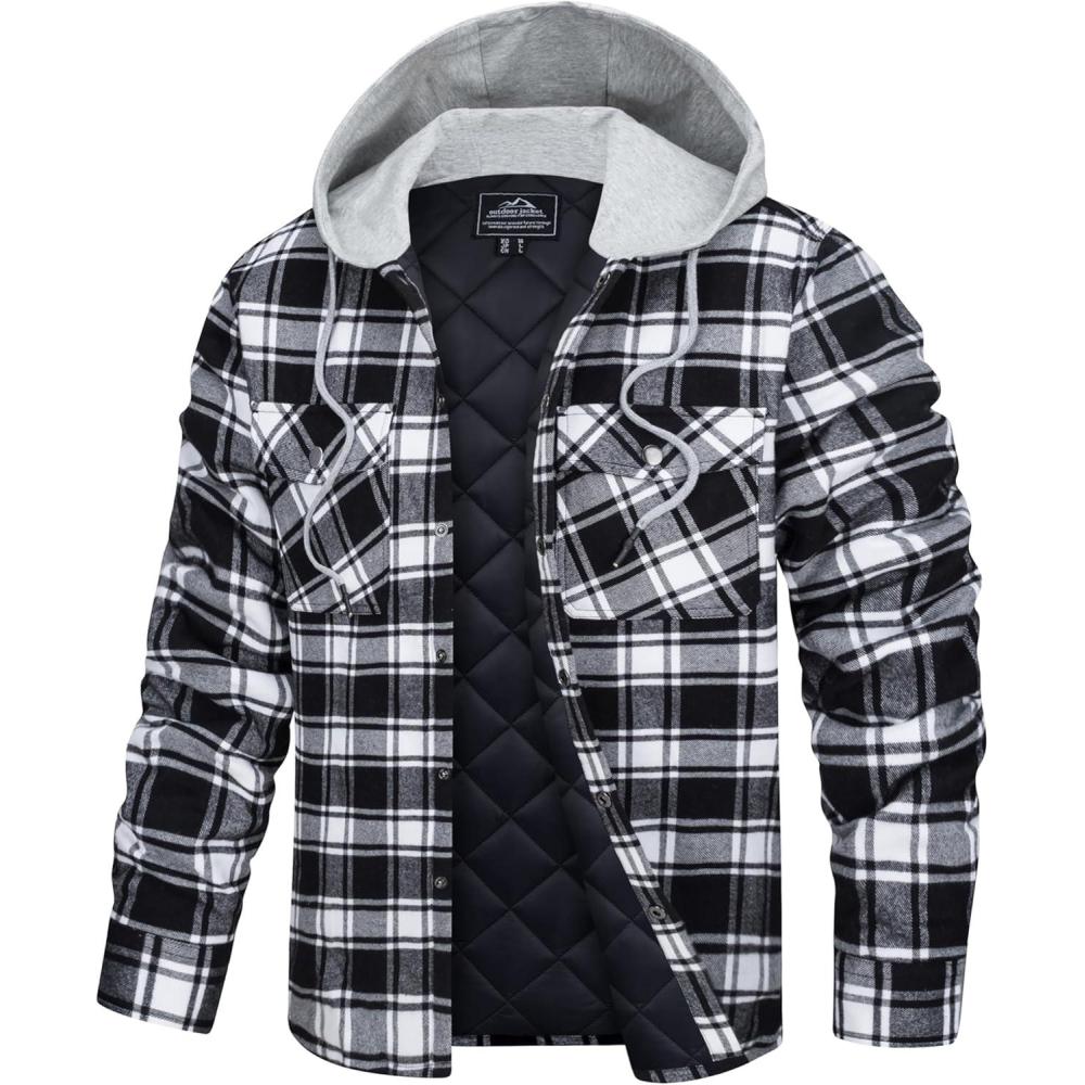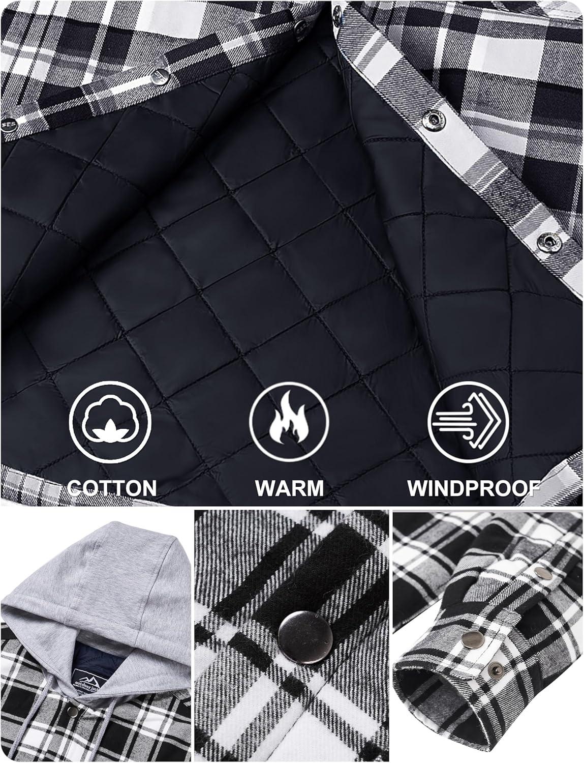 TACVASEN Men’s Flannel Jacket with Hood Quilted Lined Plaid Shirts Jacket Cotton Long Sleeve Button Down Shirt Shacket(Black Grey)