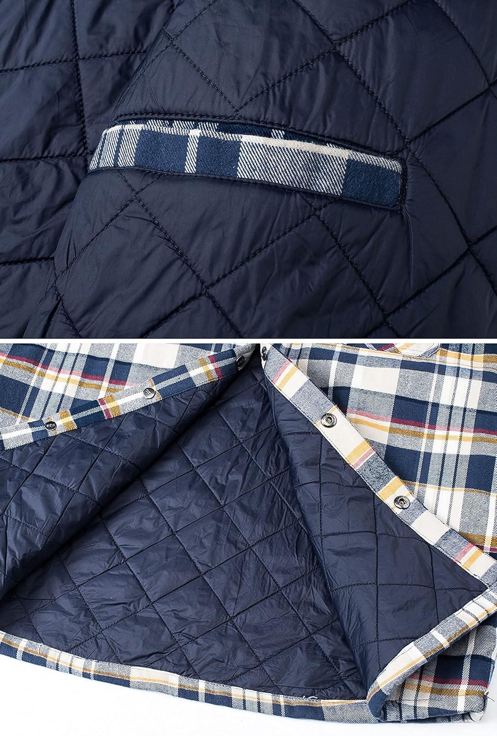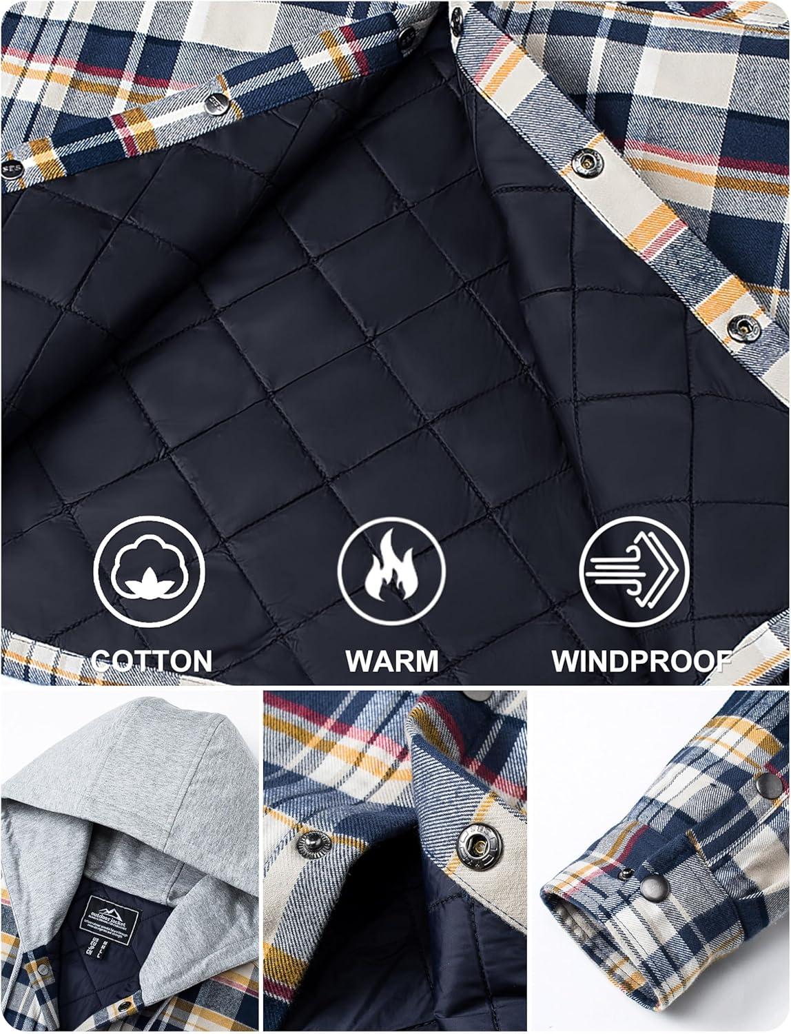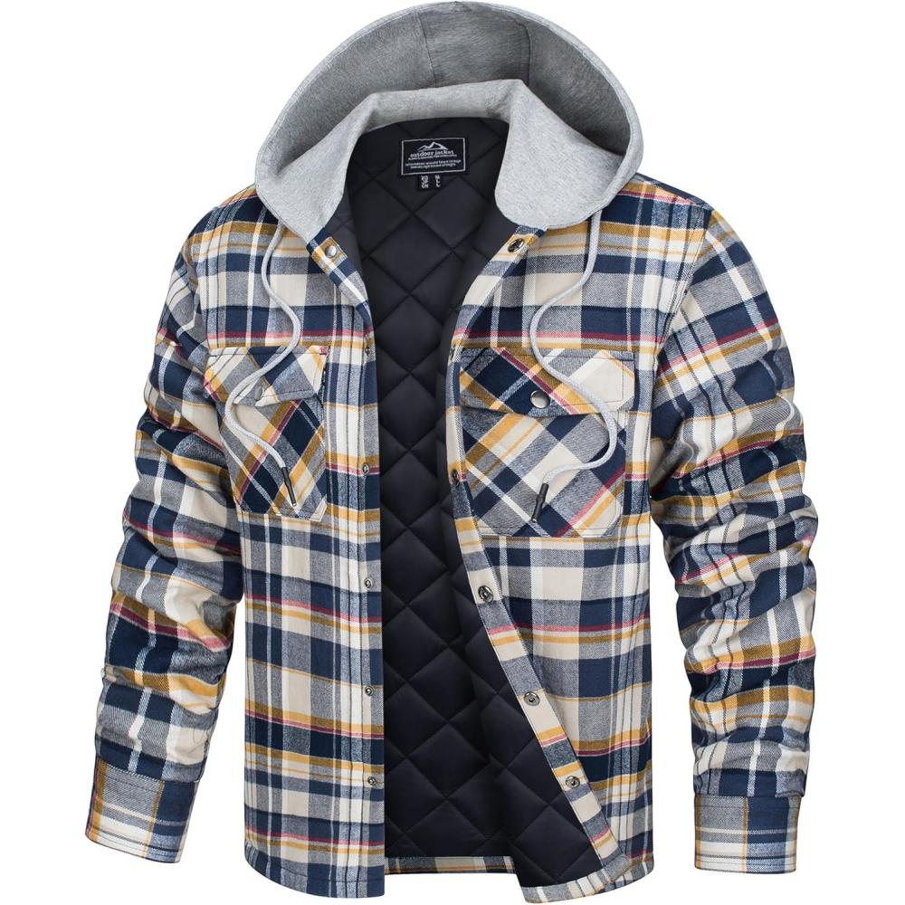 TACVASEN Men’s Flannel Jacket with Hood Quilted Lined Plaid Shirts Jacket Cotton Long Sleeve Button Down Shirt Shacket(Yellow)