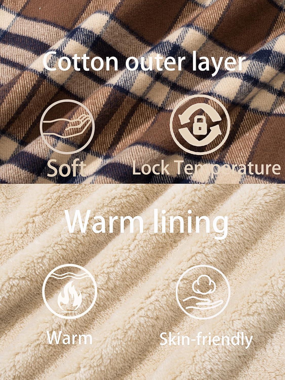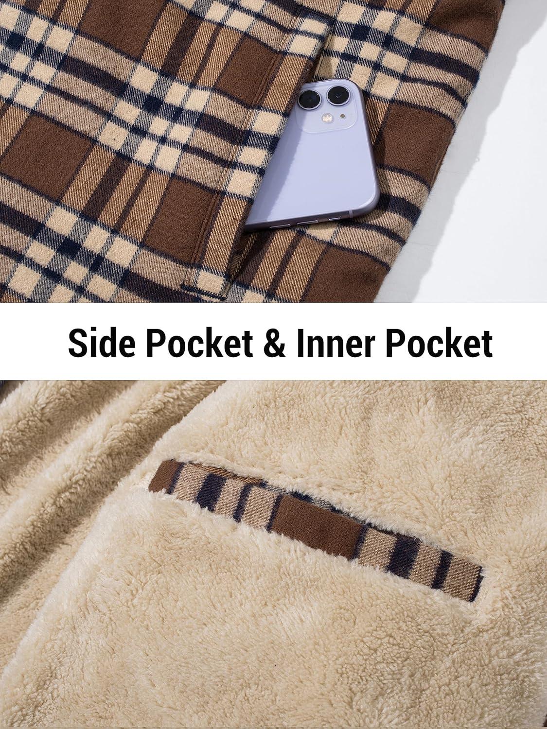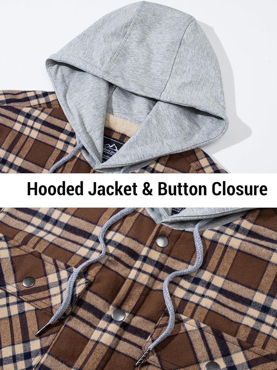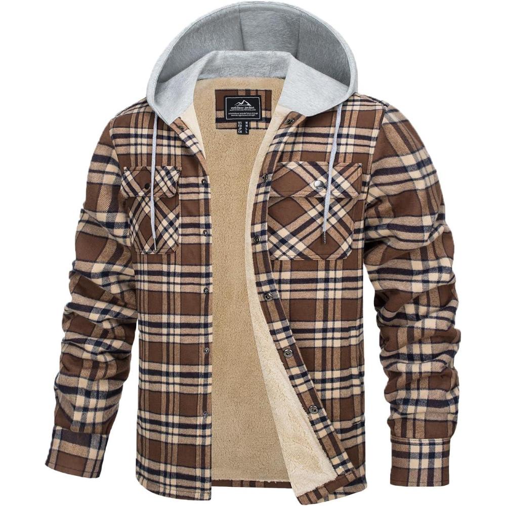 TACVASEN Men’s Flannel Jacket with Pockets Shacket Plaid Shirts Fleece Padded shirt Button Down Jackets with Hood(Brown Khaki)