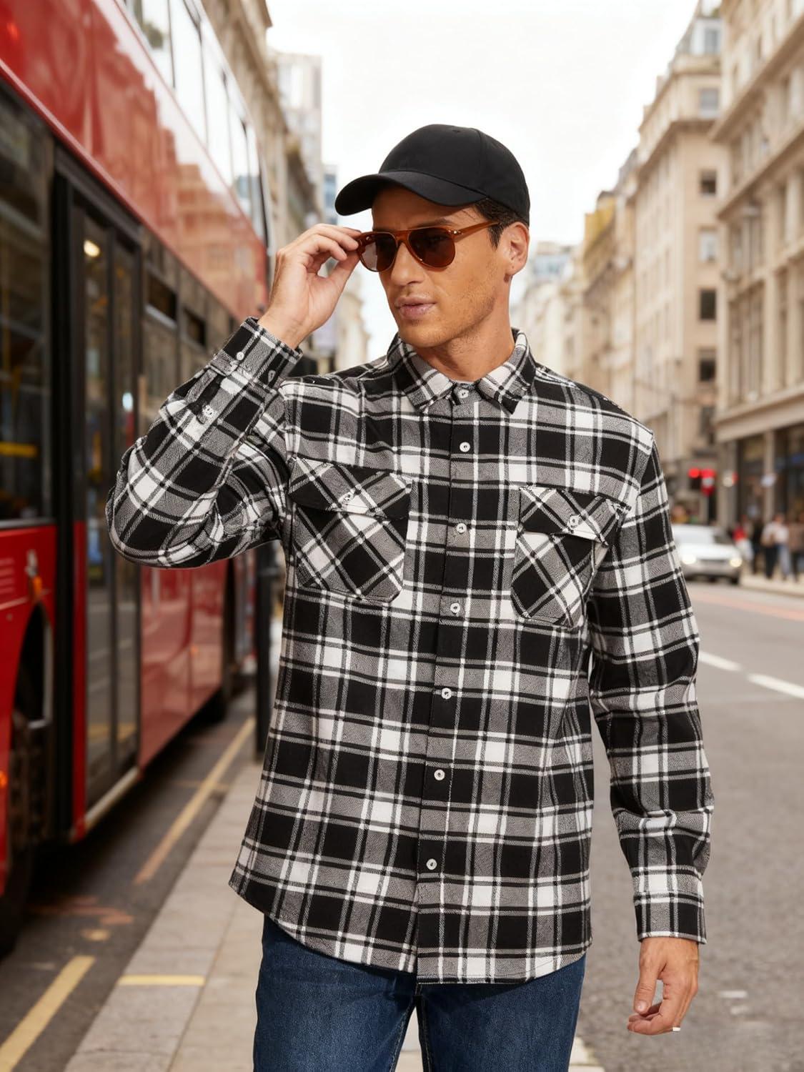 TACVASEN Mens Flannel Shirt Long Sleeve Plaid Shirts Cotton Lightweight Casual Button Down Work Shirt with 2 Pockets(Black Grey)