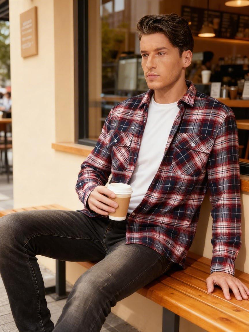 TACVASEN Mens Flannel Shirt Long Sleeve Plaid Shirts Cotton Lightweight Casual Button Down Work Shirt with 2 Pockets(Red White)