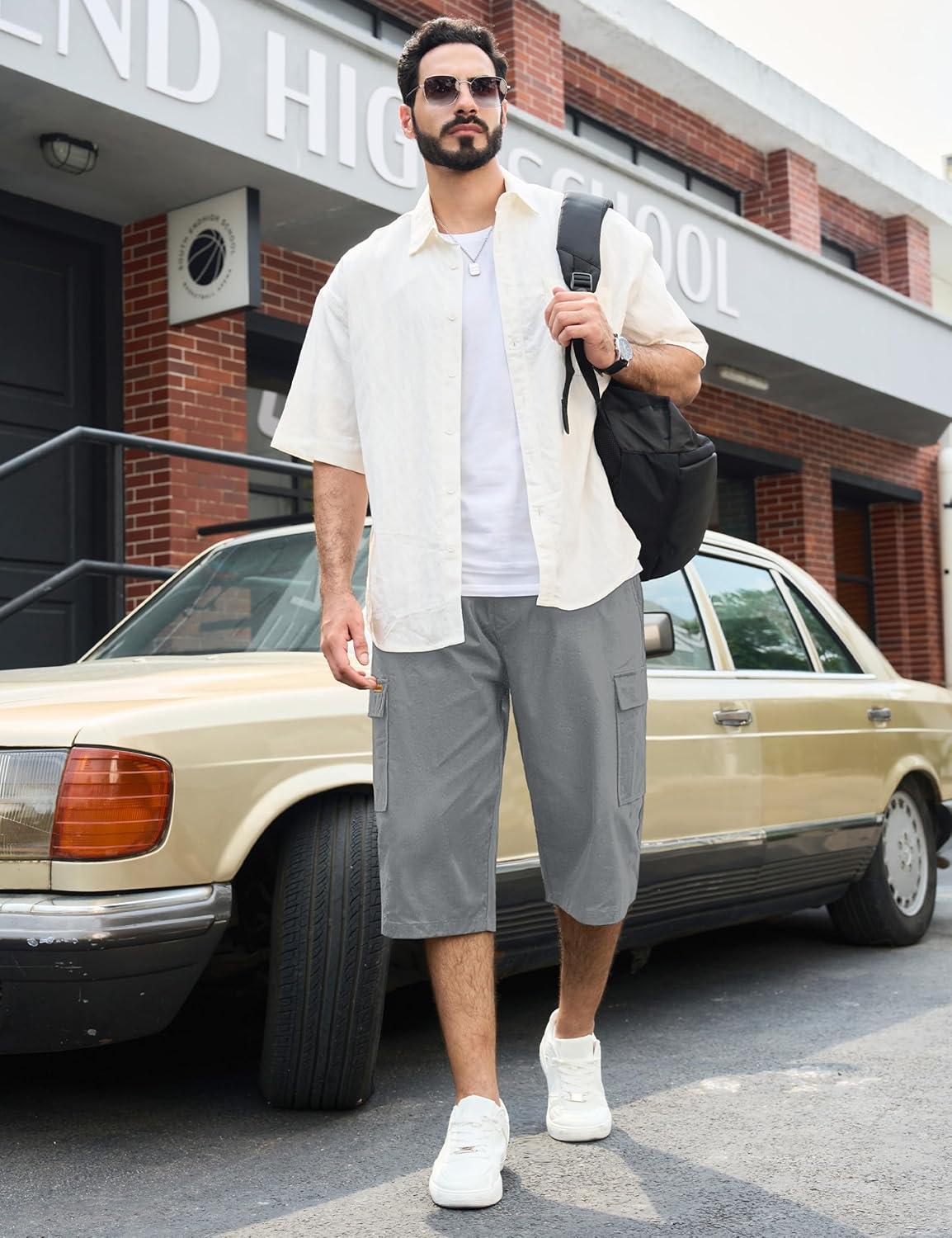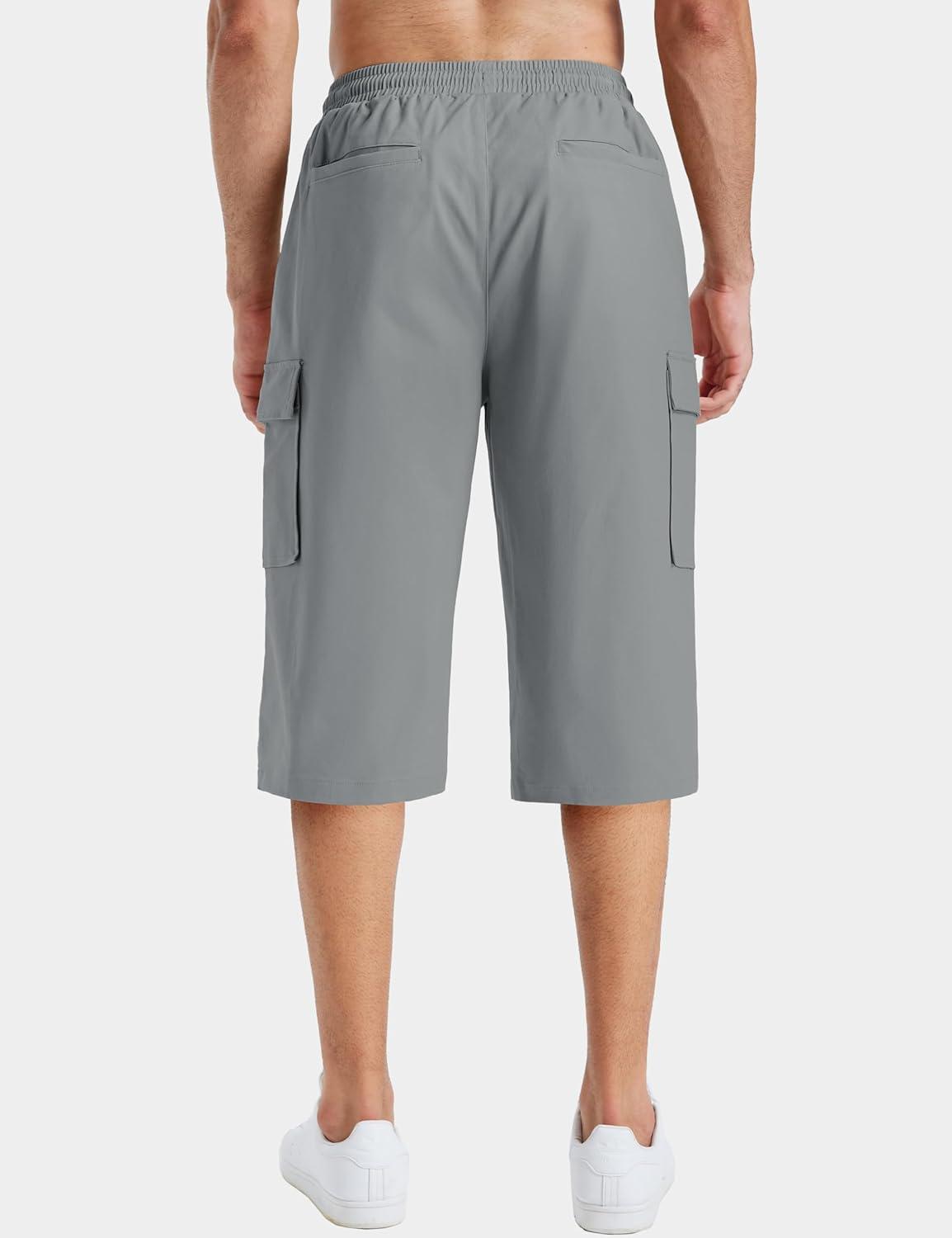 TACVASEN Men’s Long Cargo Shorts Cotton Below Knee Capris with 6 Pockets Drawstring Elastic Waistband Capri Pants(#03lgray)