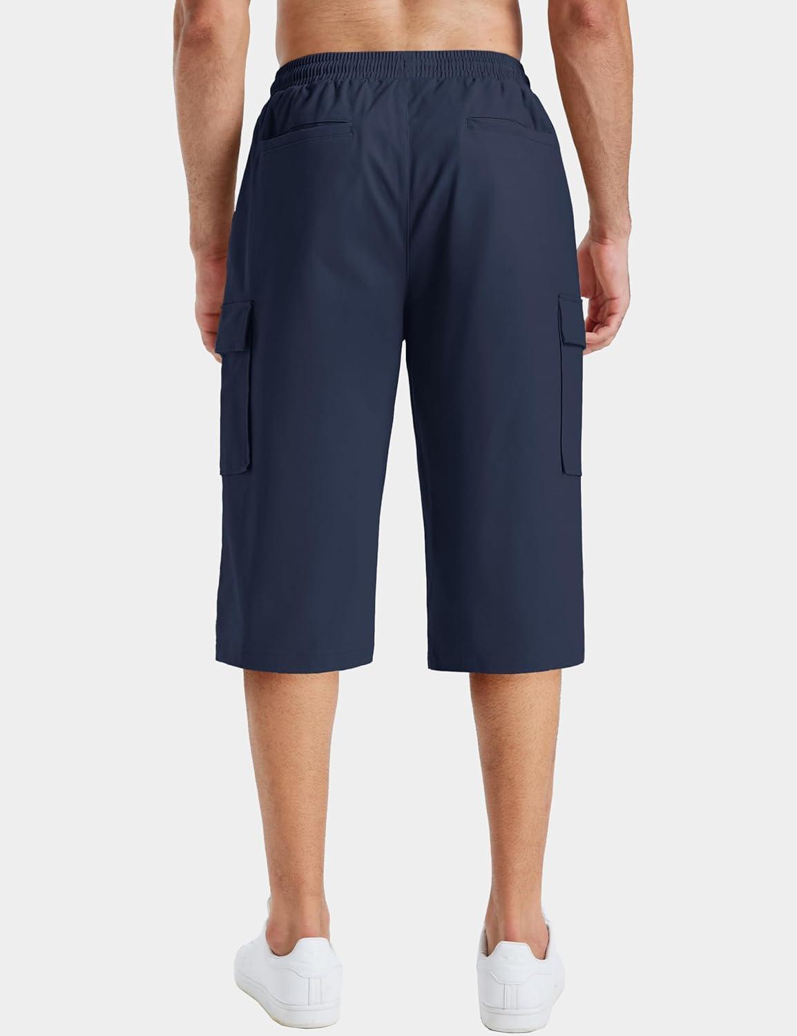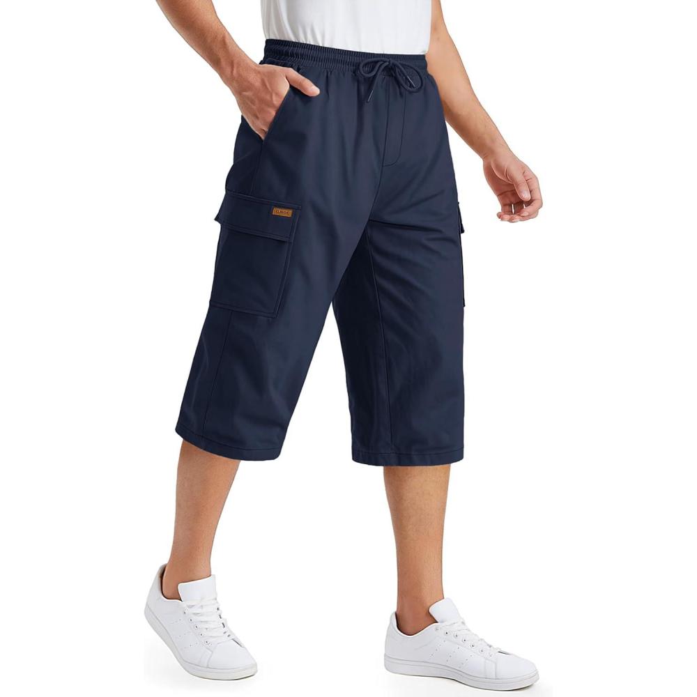 TACVASEN Men’s Long Cargo Shorts Cotton Below Knee Capris with 6 Pockets Drawstring Elastic Waistband Capri Pants(#05navy)