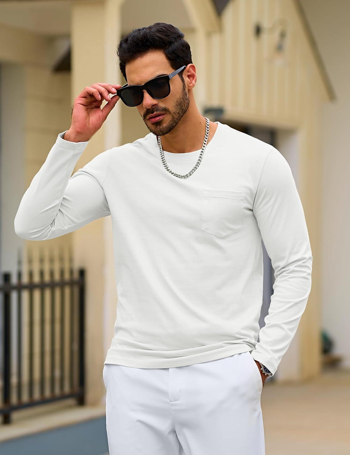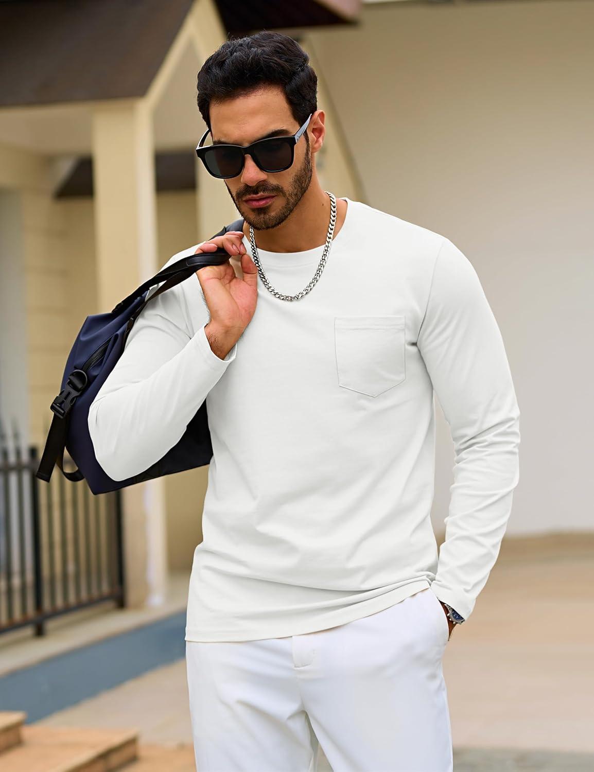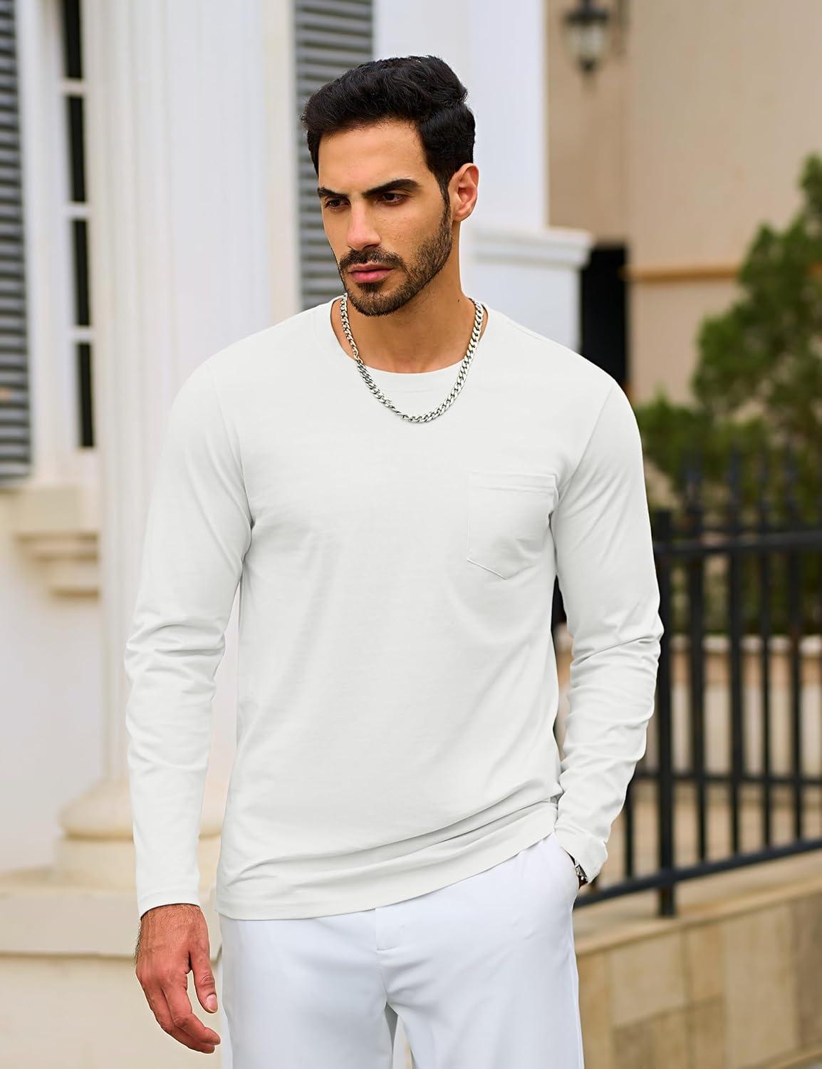 TACVASEN Mens Long Sleeve Tee Shirts Cotton Lightweight Casual Pocket Crew Neck Work T Shirts for All Season(#02-white)