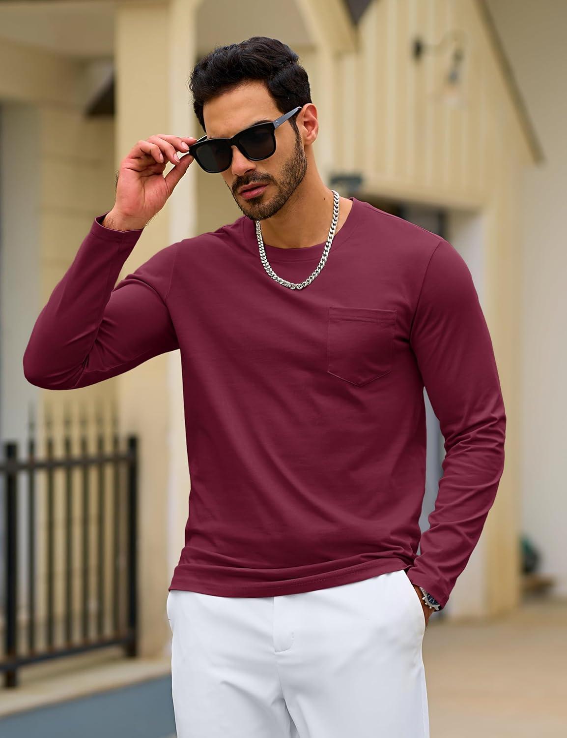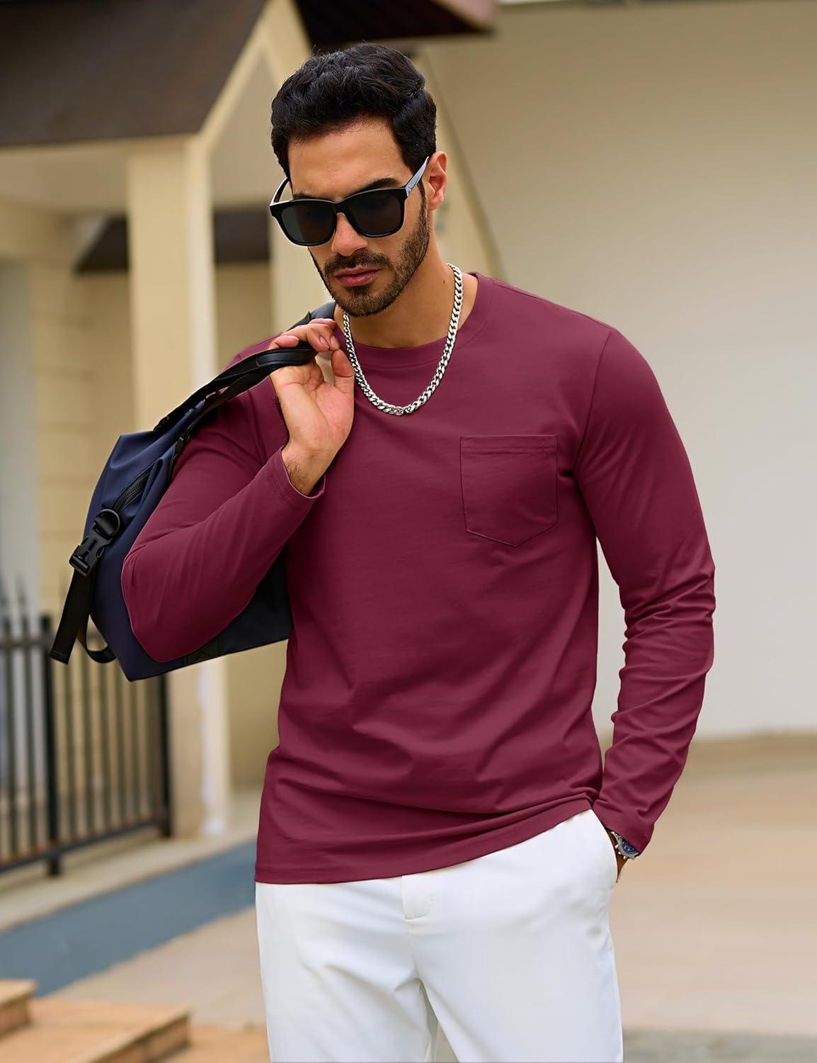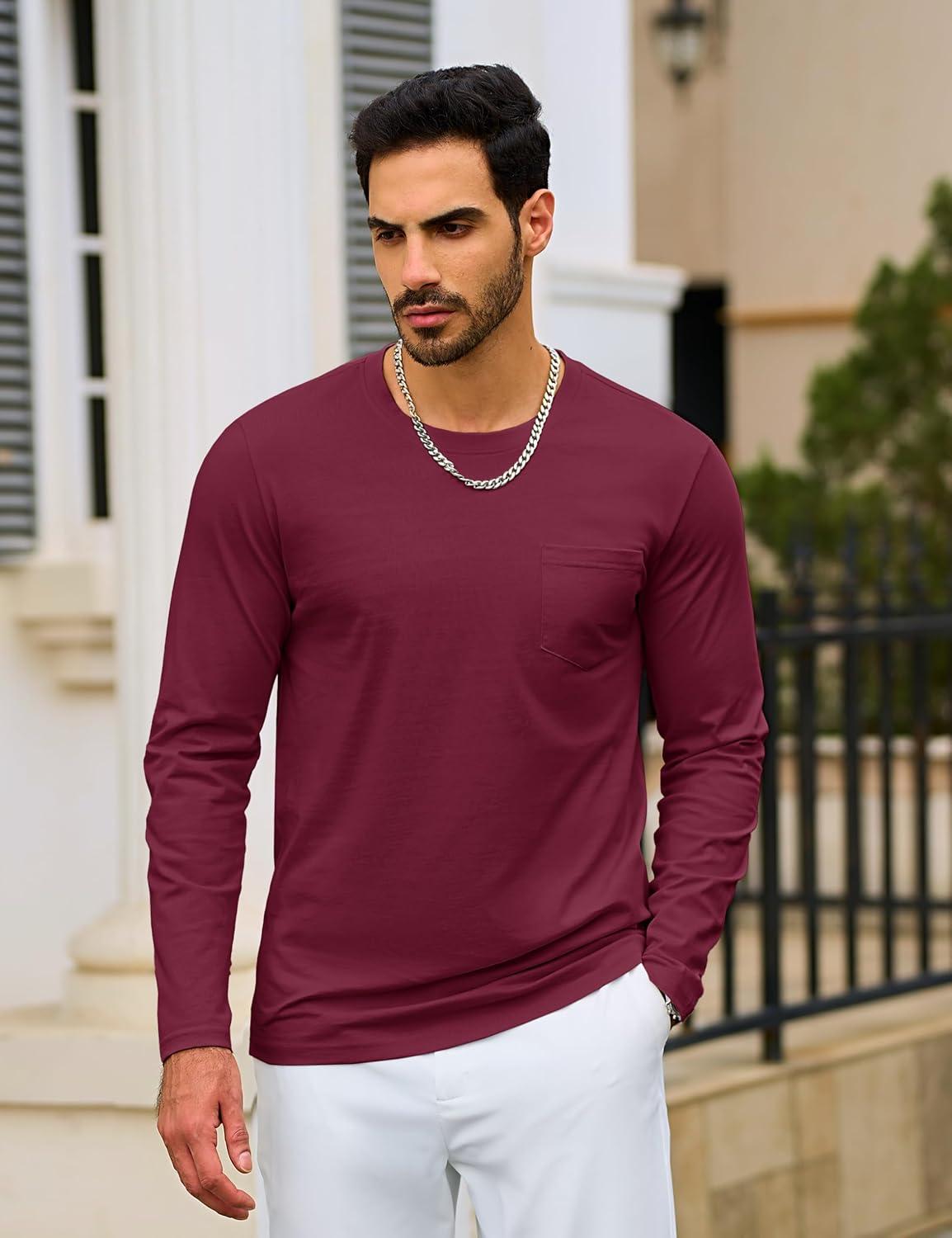 TACVASEN Mens Long Sleeve Tee Shirts Cotton Lightweight Casual Pocket Crew Neck Work T Shirts for All Season(#14-winered)