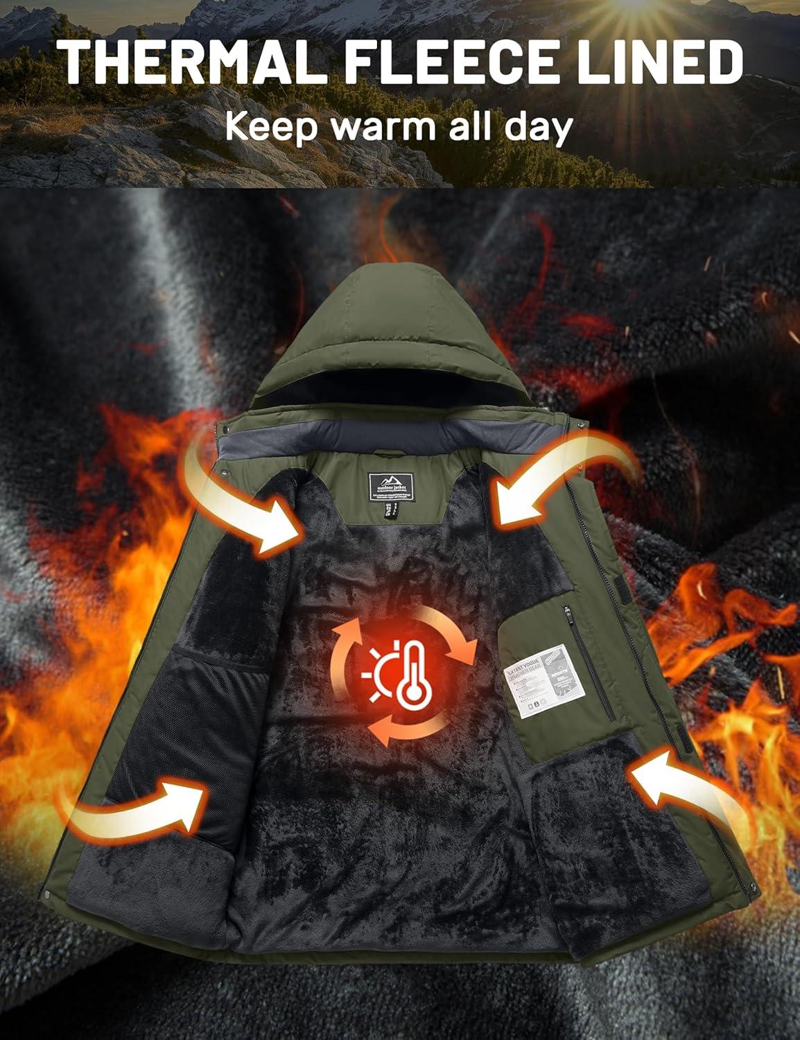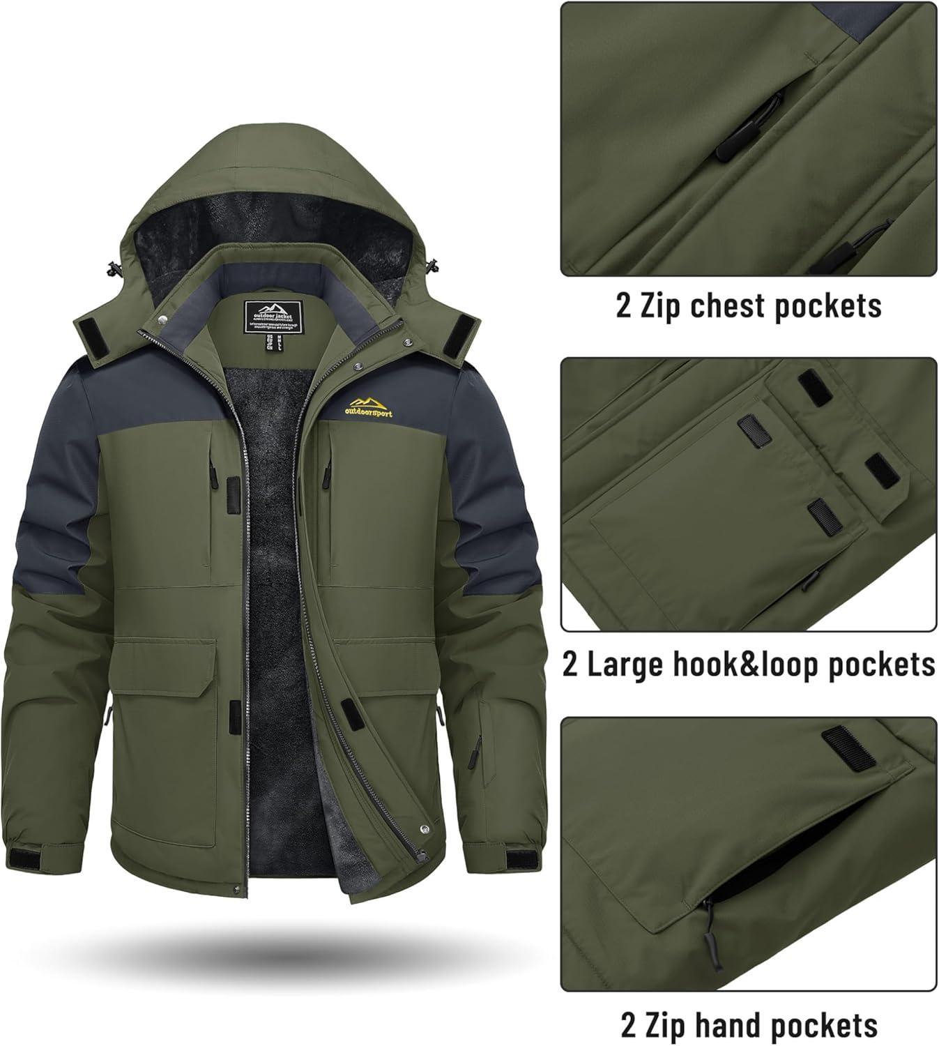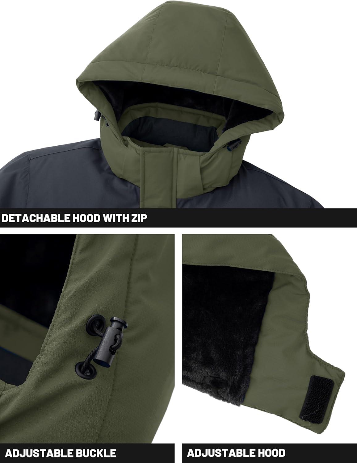 Men's Winter Jacket Waterproof Fleece Coat Warm Insulated Parka Windproof Ski Snowboard Jacket with Detachable Hood And Multi-Pockets