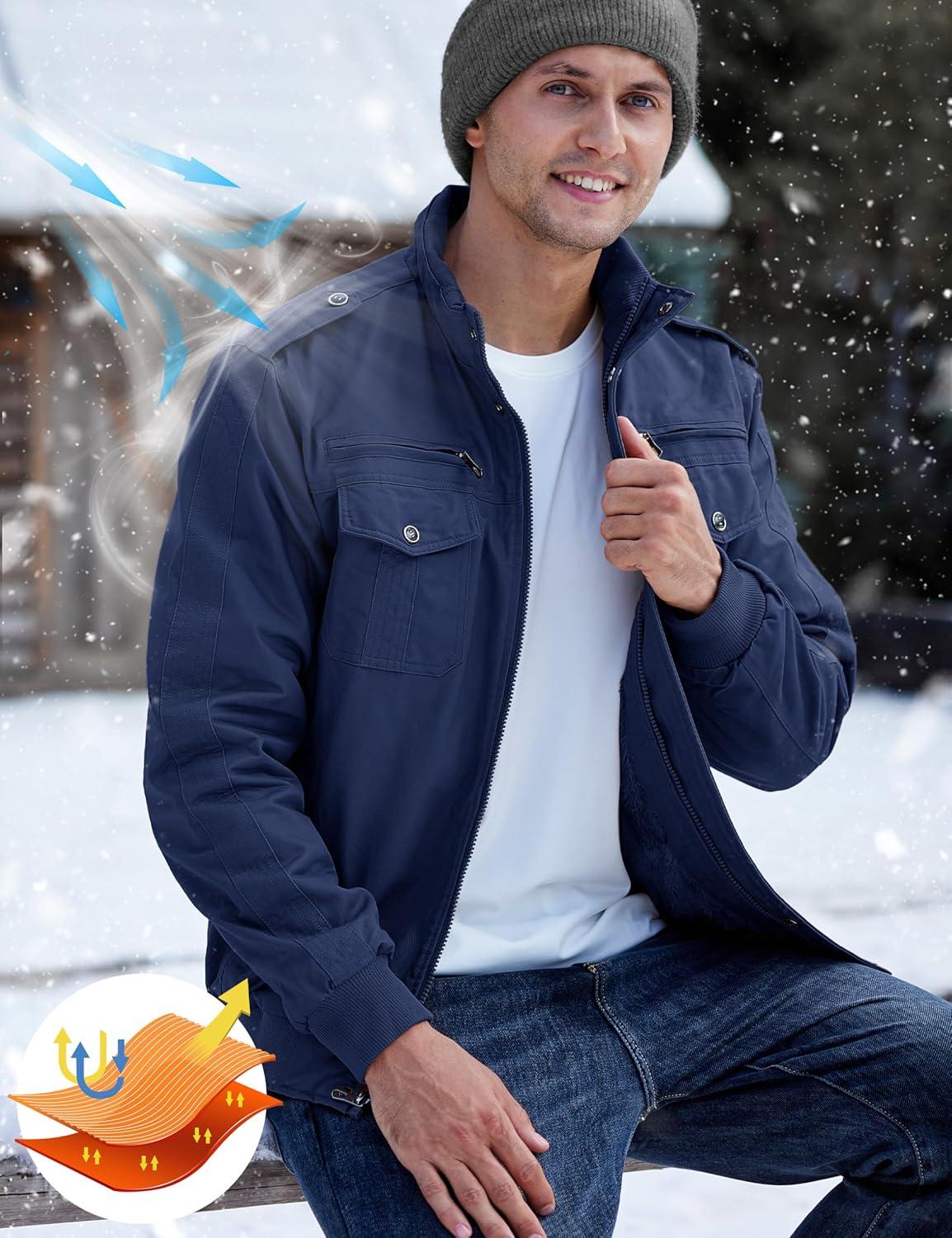 TACVASEN Men’s Winter Jacket Fleece Lined Military Jacket Cargo Windbreaker Zip Front Stand Collar Coat with Multi Pockets(Denim Blue)