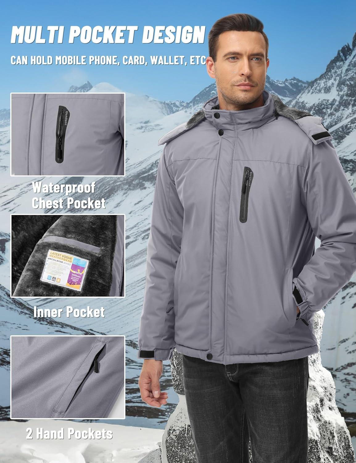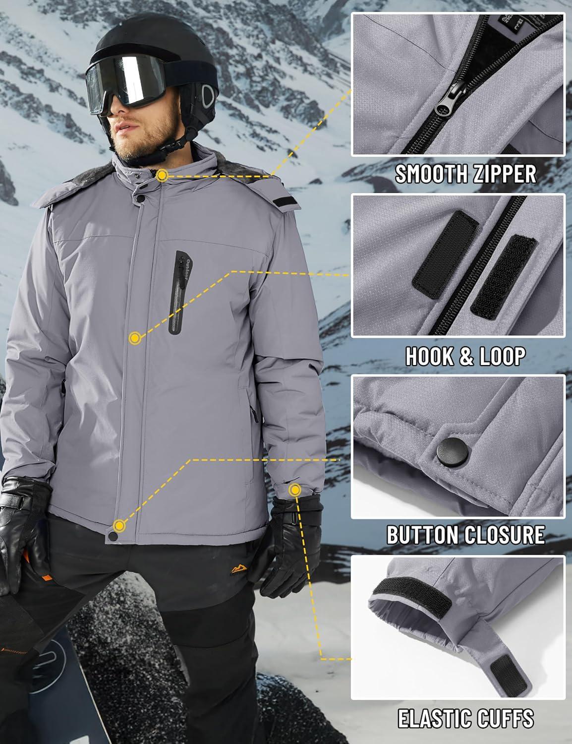 TACVASEN Men’s Winter Jacket Waterproof Ski Coat Warm Fleece Lined Windproof Snowboard Jacket with 4 Pockets Hiking(Grey)