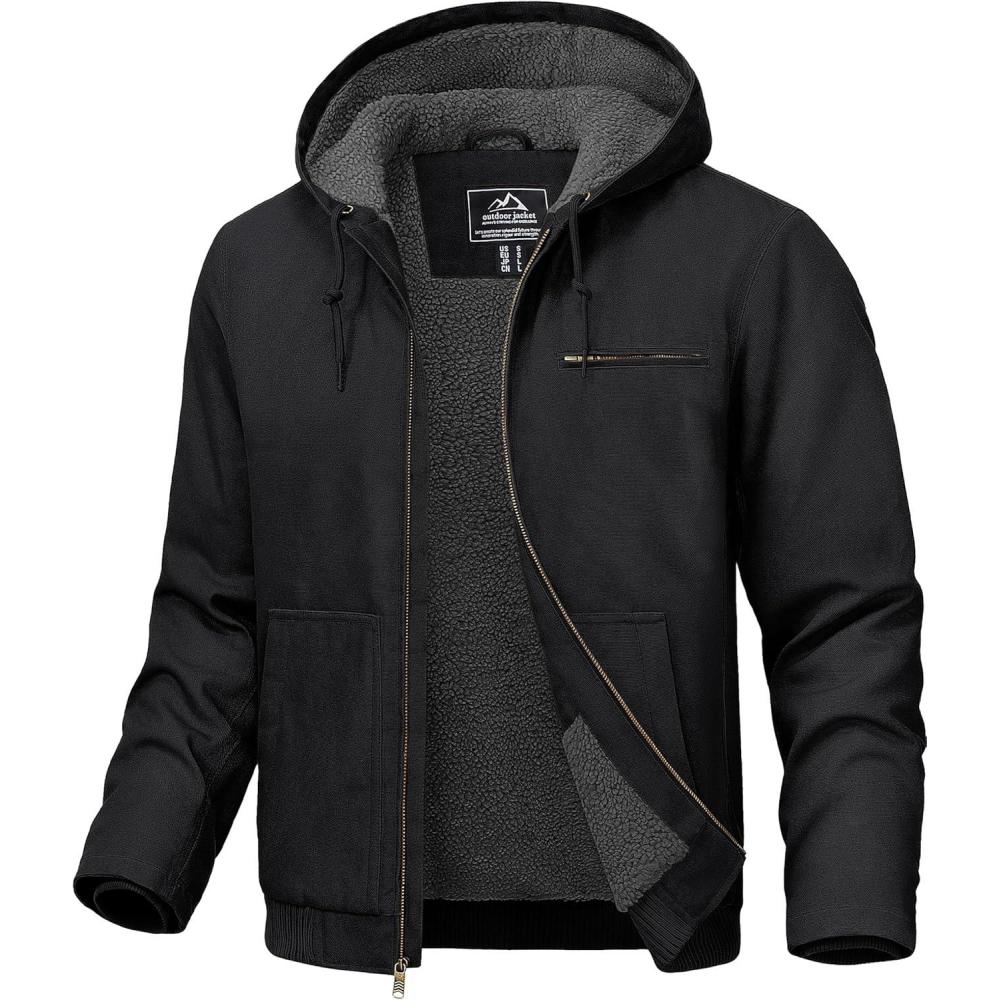 TACVASEN Men’s Winter Work Jacket Sherpa Fleece Lined Heavyweight Washed Duck Canvas Cotton Jacket Water-Repellent Hooded(Black)