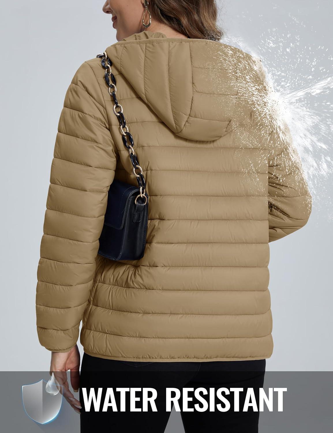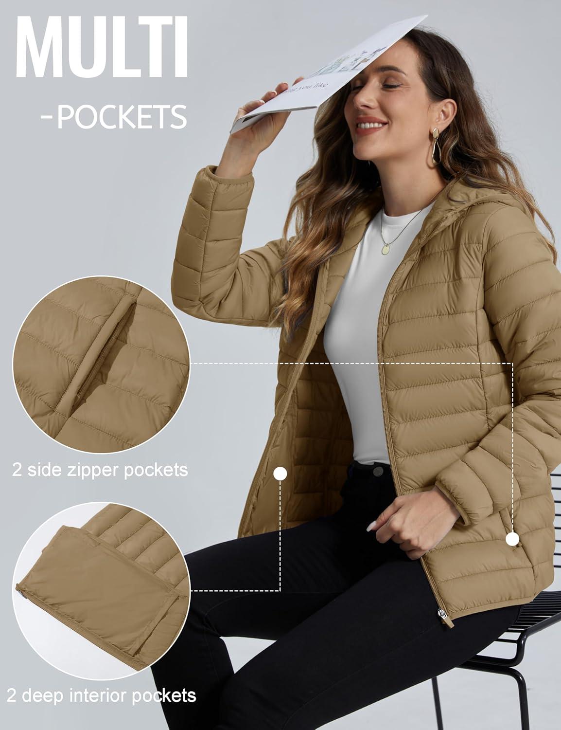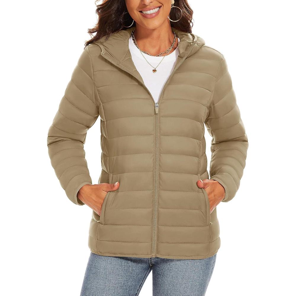 TACVASEN Women’s Lightweight Puffer Jacket with Hood Pockets Quilted Padded Full-zip Water-Resistant Winter Coat(Khaki)