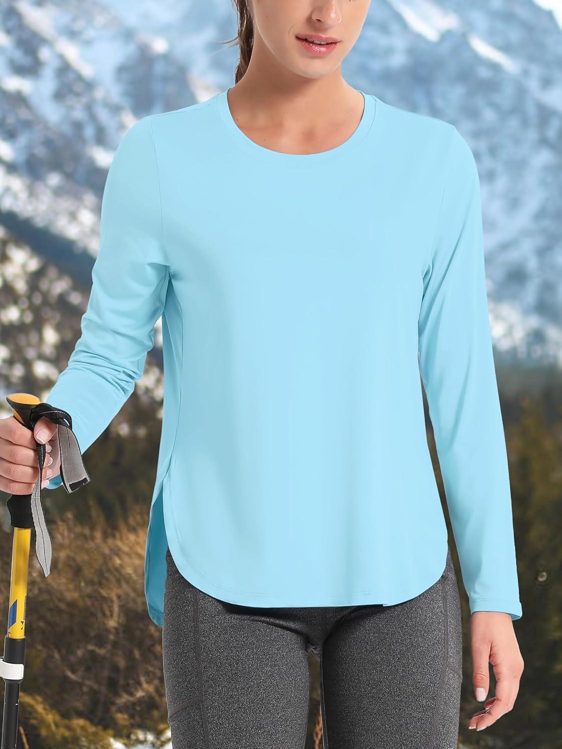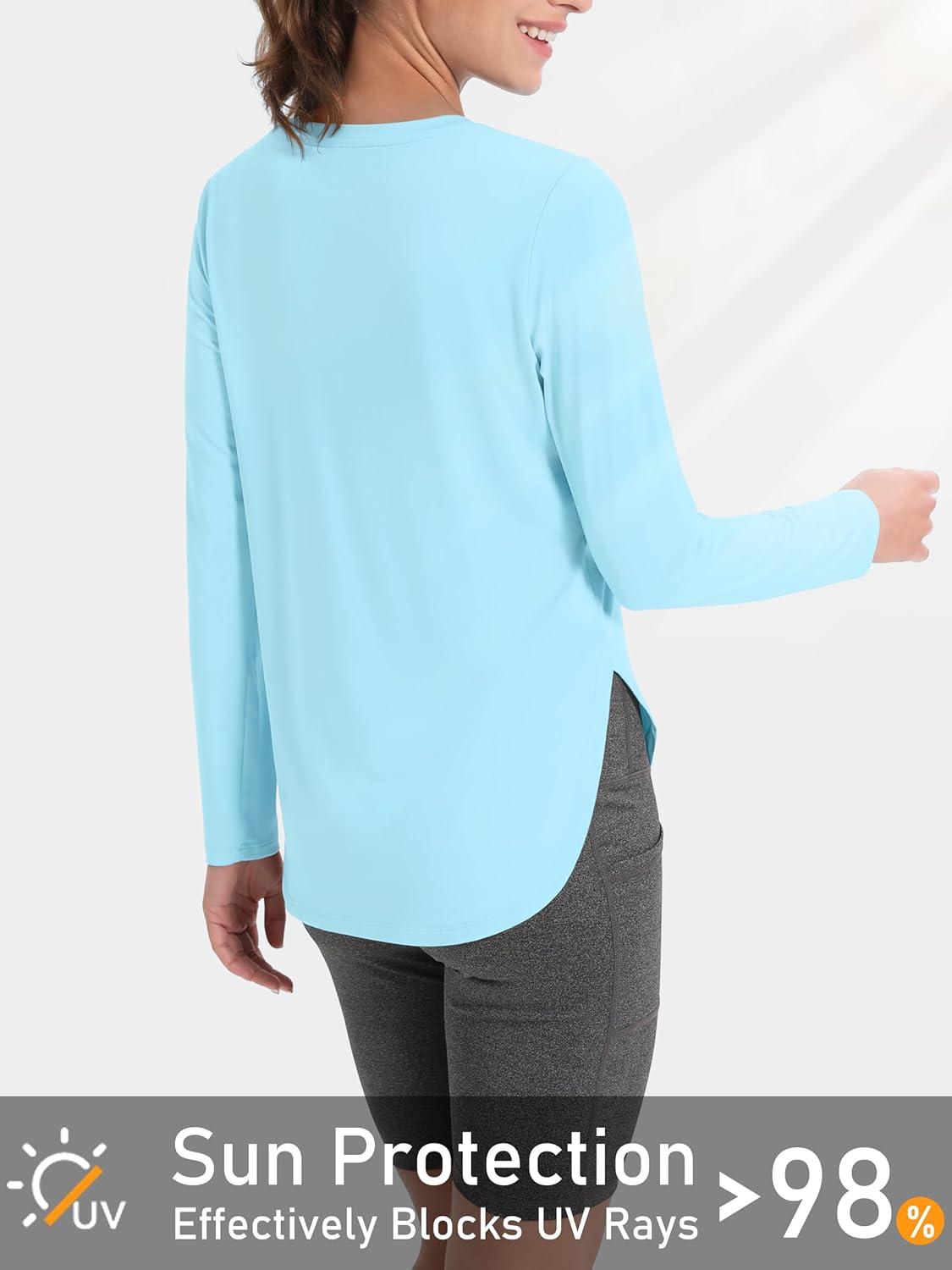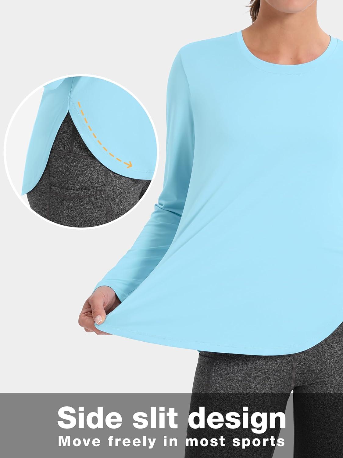 long sleeve crew neck activewear top with 170g single-sided fabric,side slits with high & low hem,UPF 80+,lightweight & breathable,moisture-wicking​
