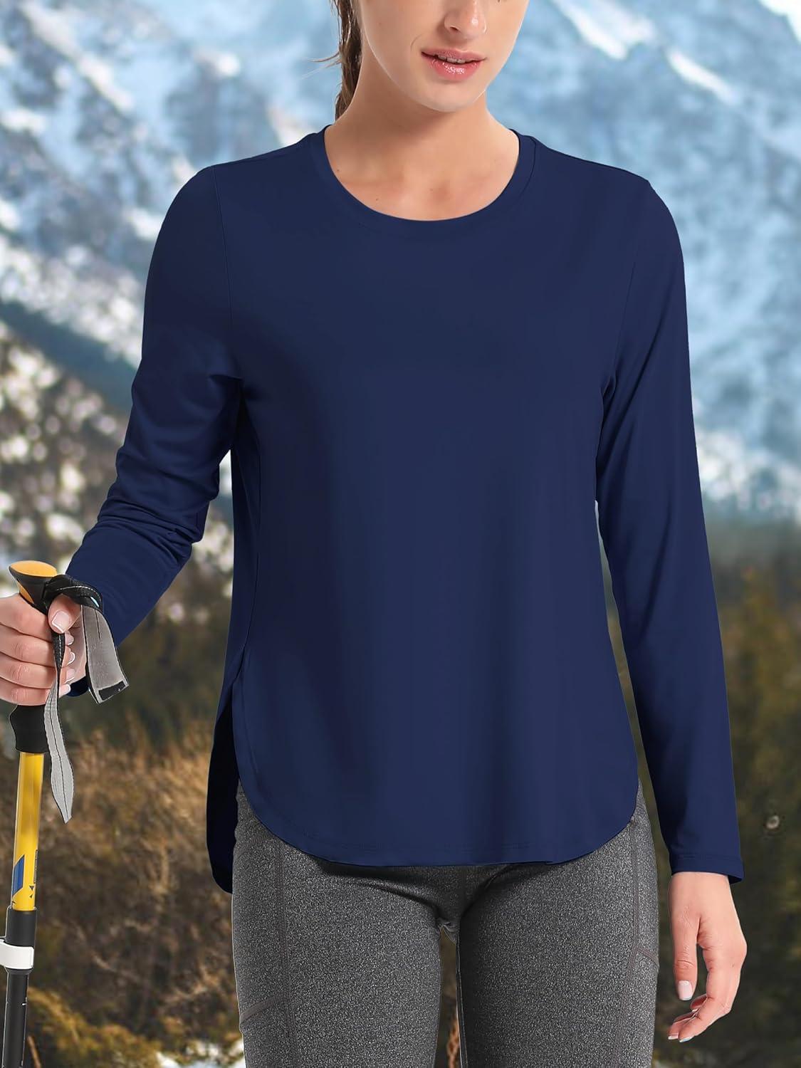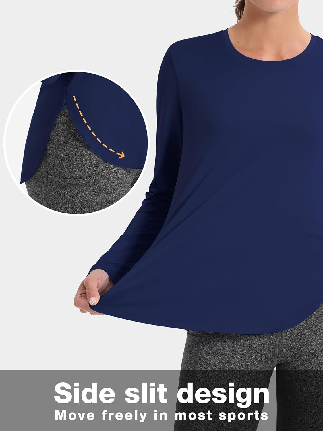 long sleeve crew neck activewear top with 170g single-sided fabric,side slits with high & low hem,UPF 80+,lightweight & breathable,moisture-wicking​