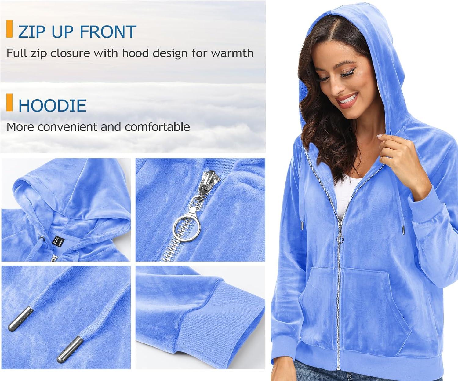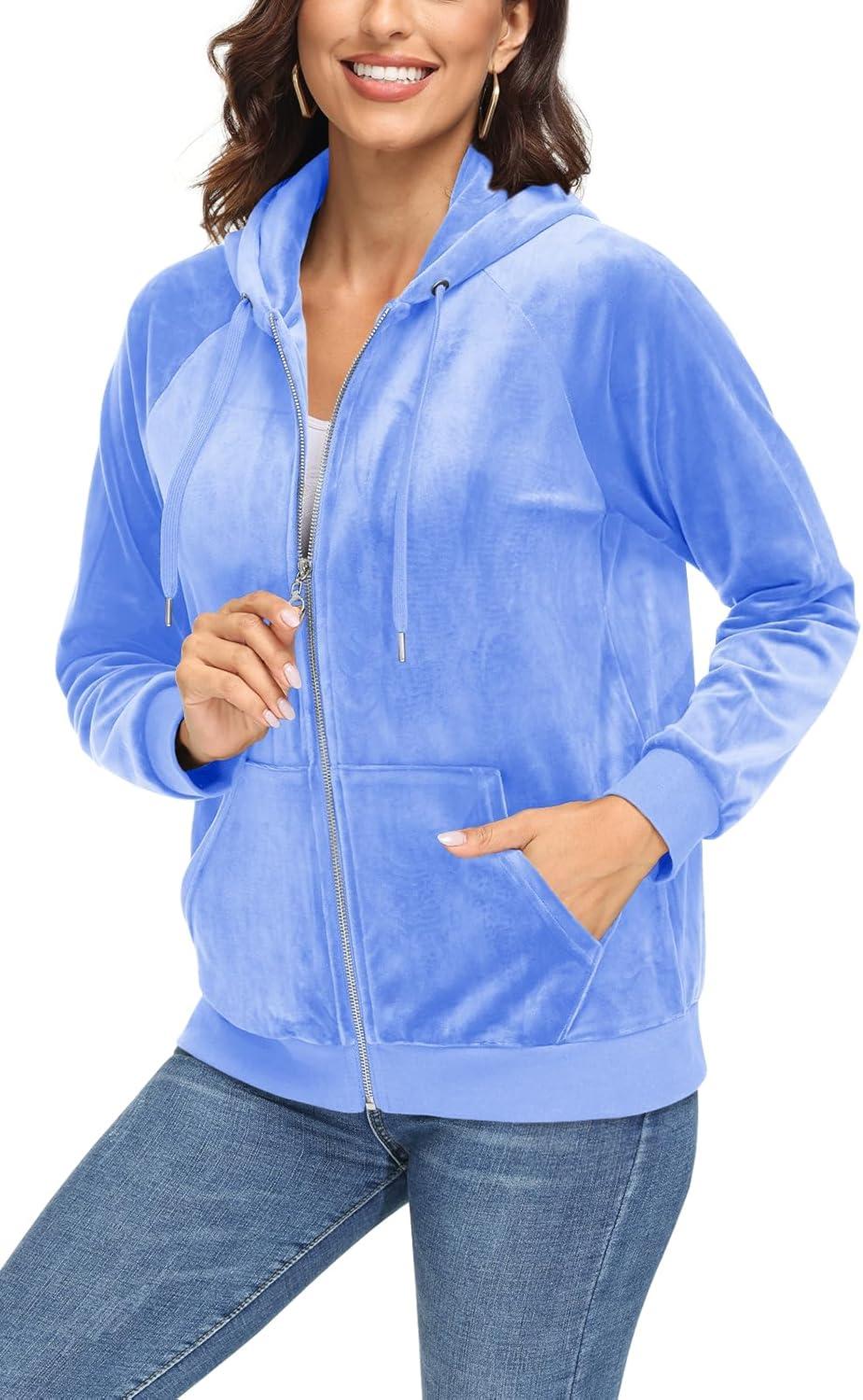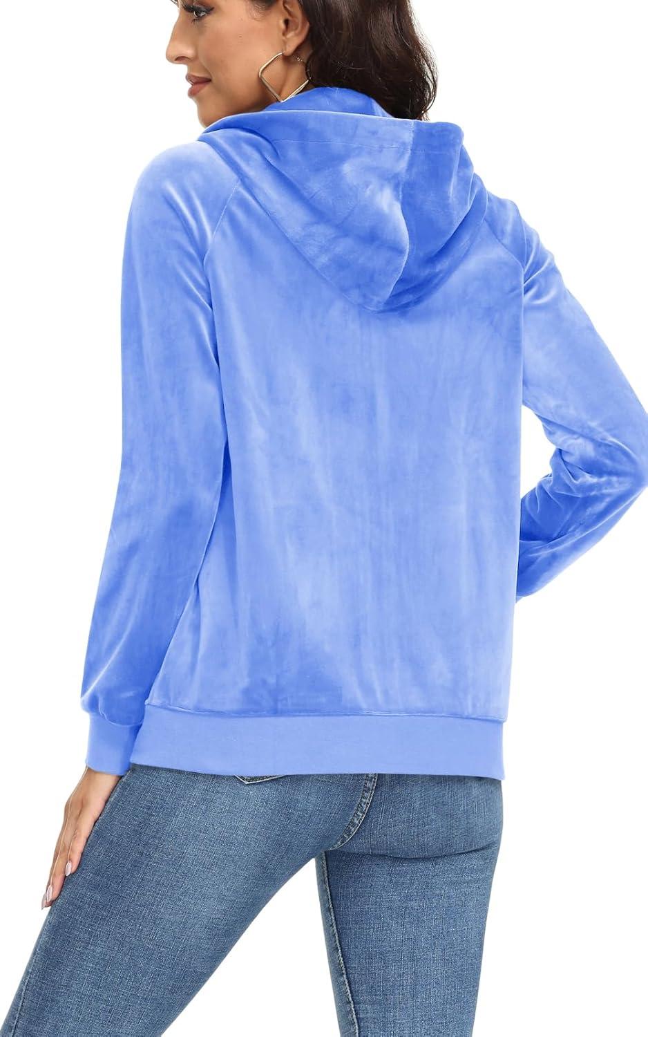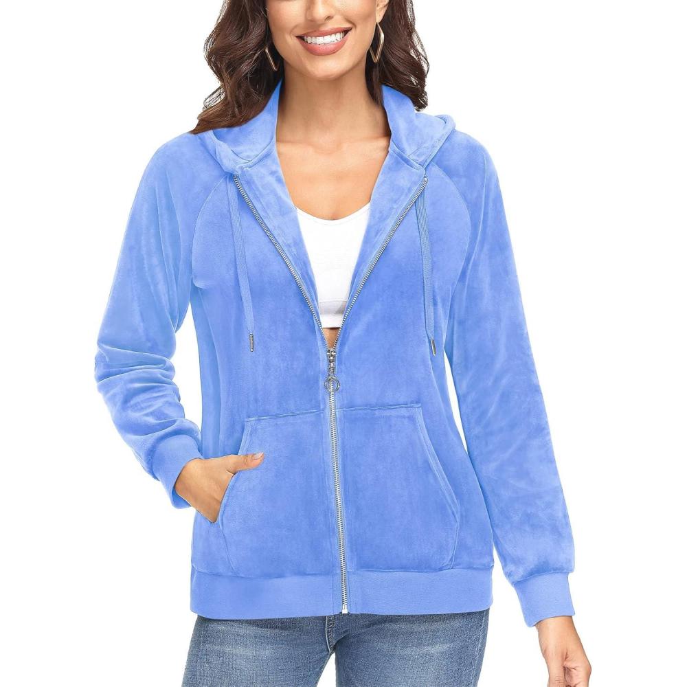 TACVASEN Women’s Velour Jacket with Hood Long Sleeve Soft Fleece Hooded Full Zip(Light Blue)