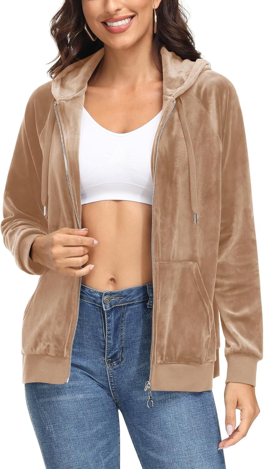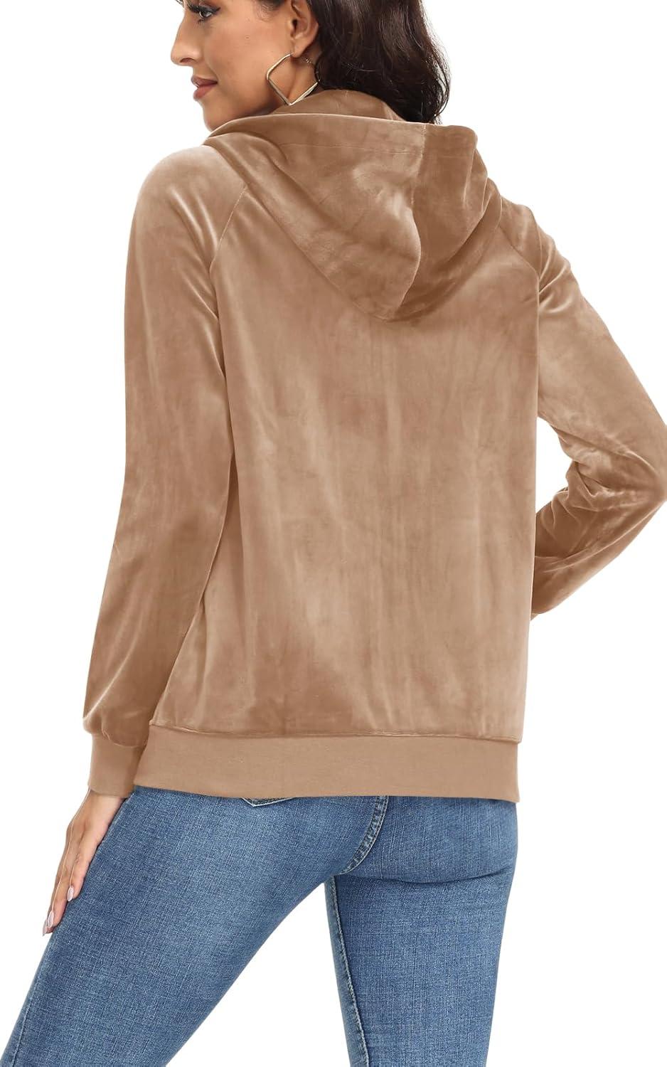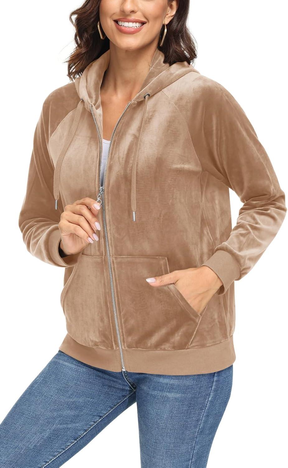TACVASEN Women’s Velour Jacket with Hood Long Sleeve Soft Fleece Hooded Full Zip(Light Brown)