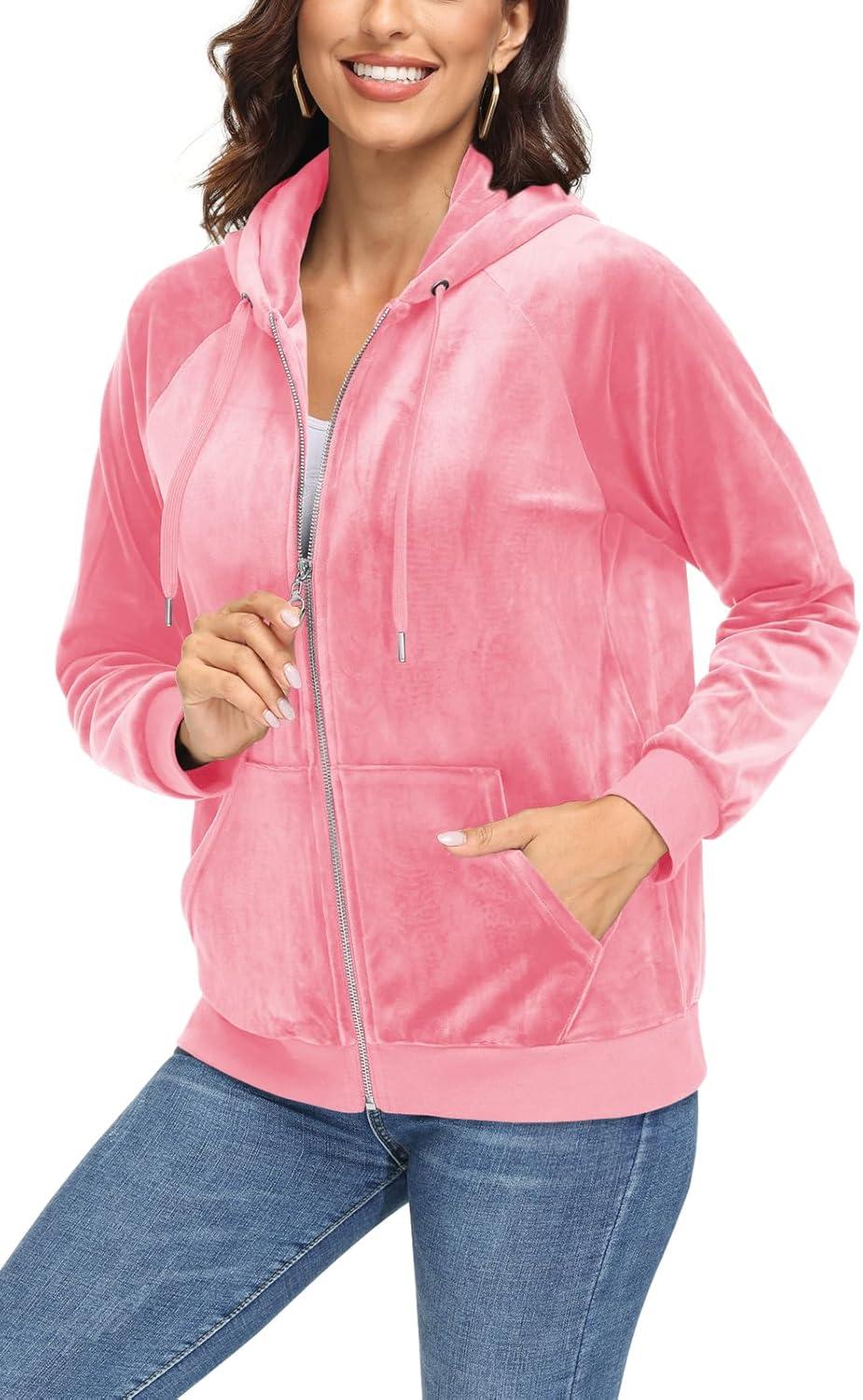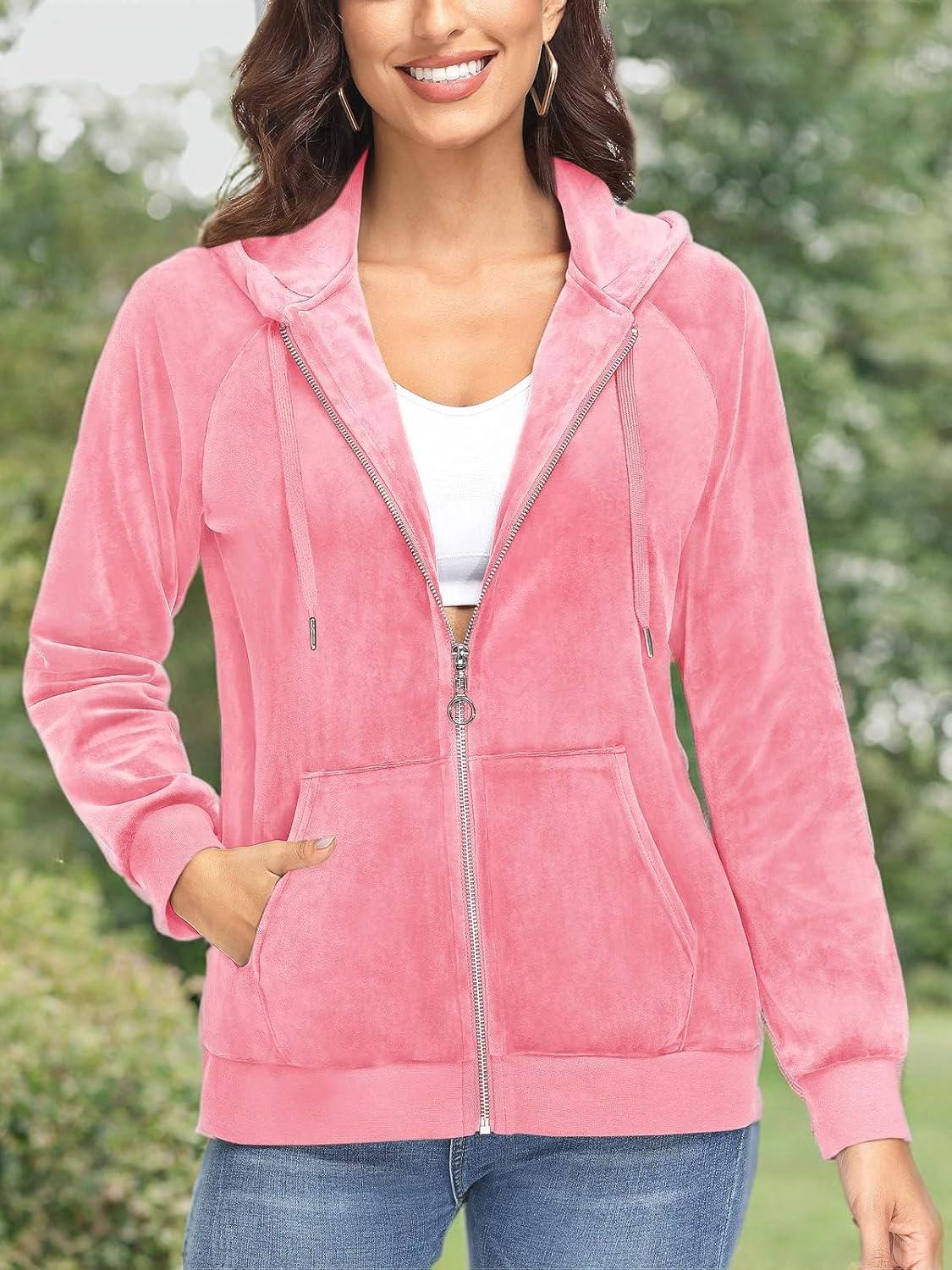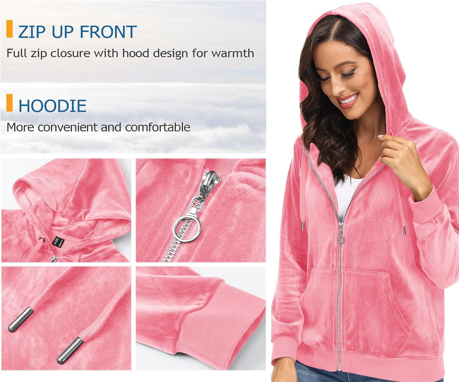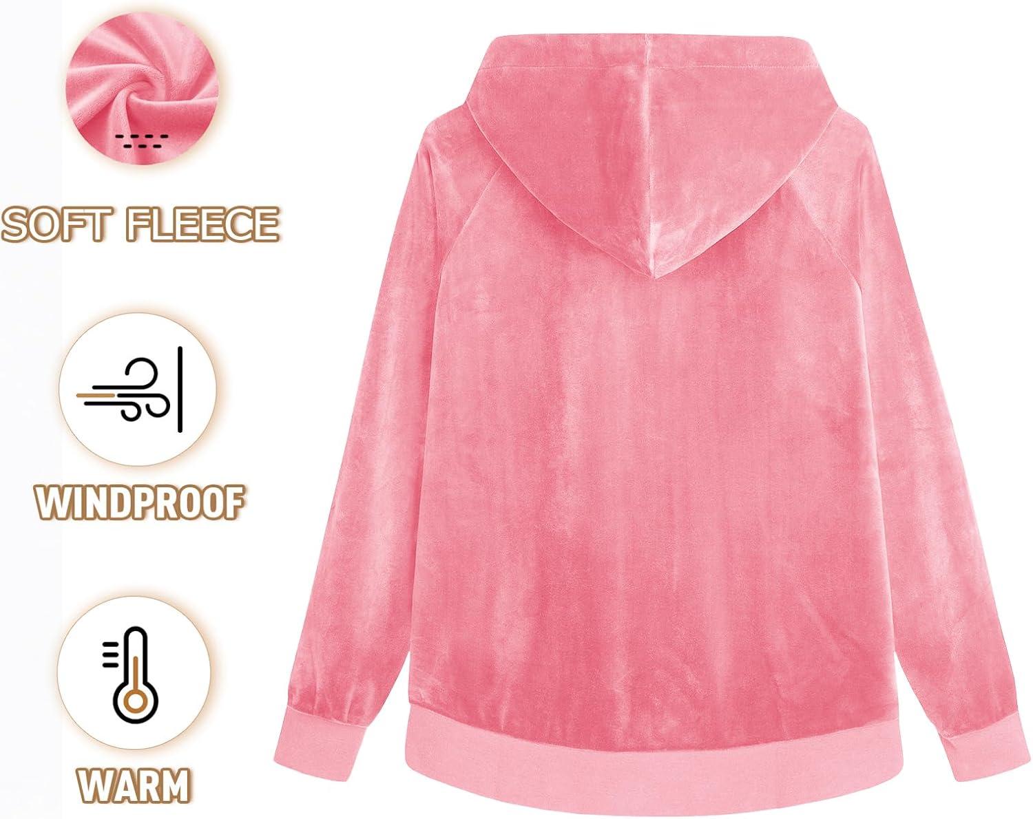 Women's Fleece Jacket with Hood Full Zip Velour Sweatshirt Long Sleeve Casual Coat with Pockets